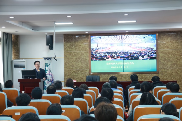 陈弘以《变革时代大学的使命与作为》为题,立足当前学校的实际情况,从“变革时代,对大学使命、任务的再认识”“立足现状,面向未来,正视机遇,直面挑战,加快建设国内一流农业大学的再思考”两个方面展开详细阐述,回答了“什么是好的教育,什么是好的大学”这一历史命题。他强调,大学必须有强烈的使命感,与国家、民族、人类前途命运紧密联系;教育工作者必须有坚定的教育信仰和教育追求;地方大学必须有清晰而正确的办学定位;大学应当厚植并坚守正确的教育价值观;大学必须有清晰的发展思路和愿景;谦卑则生,开放则活,学习则强;要以更大定力守正、更大毅力创新培养拔尖创新型人才。